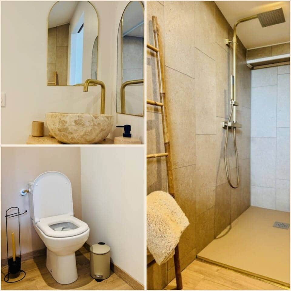 La salle de bain est équipée d’une douche moderne et de produits de toilette de qualité pour votre confort.